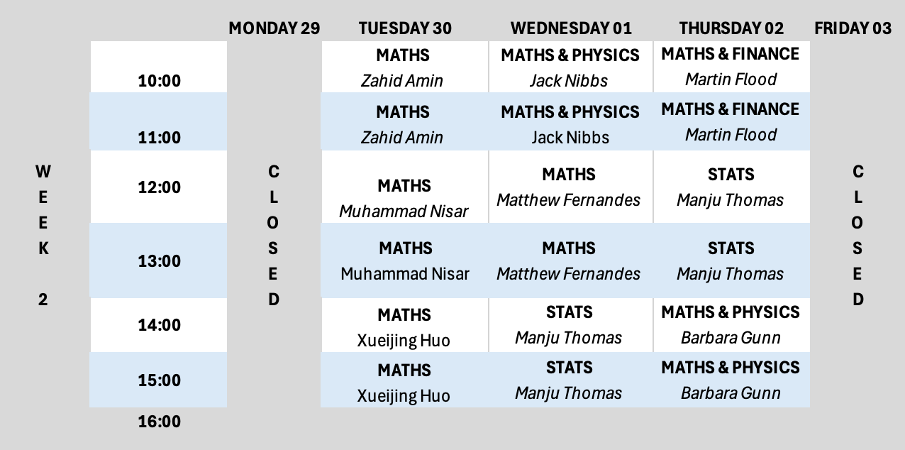 Please see below the Numeracy Drop-in Centre hours for Session 2 2025.